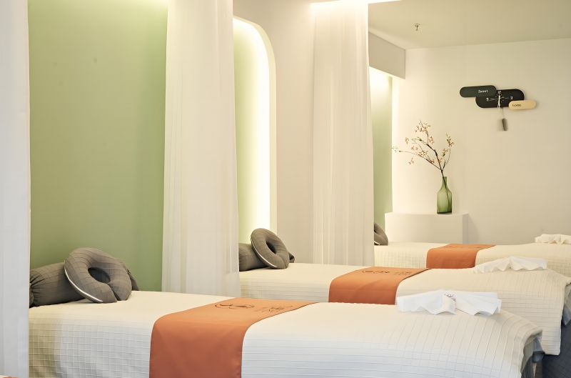 洗完澡后,穿上一次性内裤,回到包间,4位技师小姐姐都已经等候(一个人需要两个技师),我脱下浴袍,趴在床上,头放到那个孔里,呼吸不会困难,两个小姐姐给我按摩,一个按背部 ,一个按腿部
